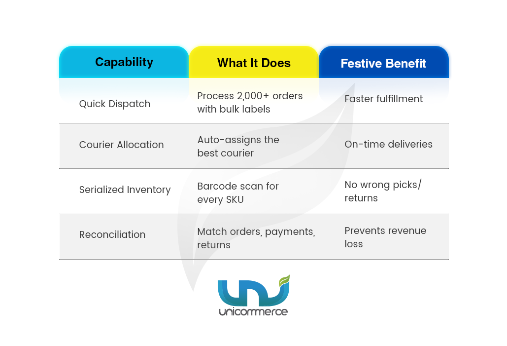Platforms like Unicommerce play a critical role in festive readiness by automating key backend processes. It enables bulk order processing, AI-powered courier allocation, barcode-based SKU tracking, and easy reconciliation. This ensures you can process thousands of orders, ship faster, and prevent revenue leakage during peak season.