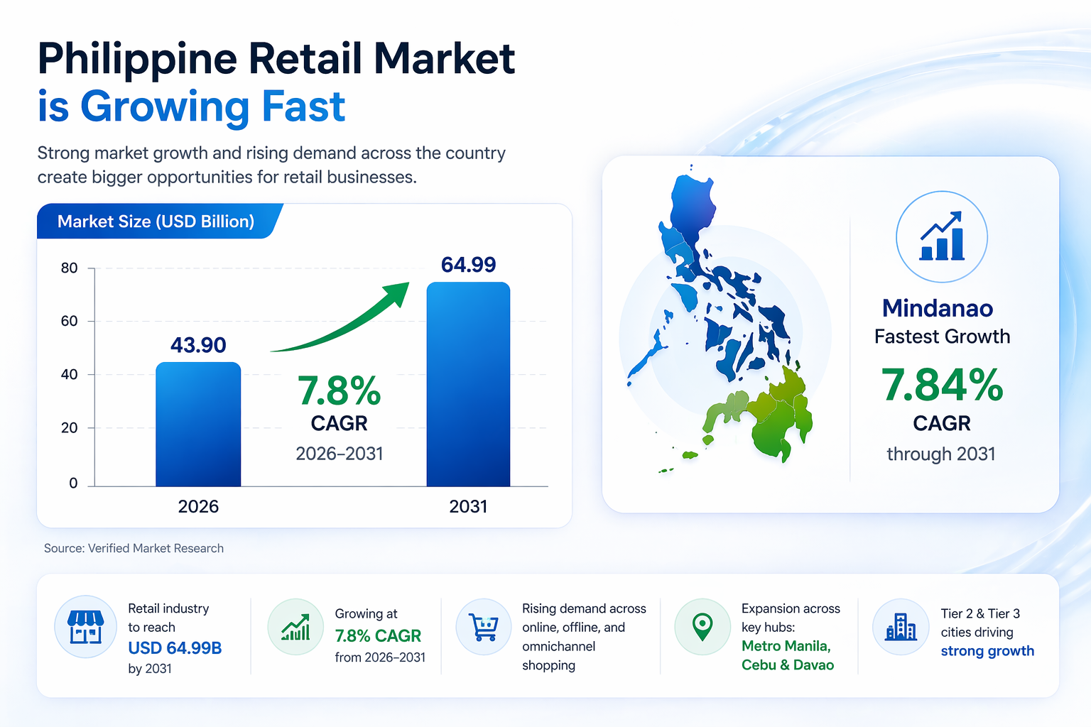 - Tier 2 and Tier 3 cities are rising fast, especially across Visayas and Mindanao, as infrastructure improves and digital shopping adoption grows. In fact, Mindanao is forecast to record the fastest 7.84% CAGR through 2031 in the retail market.