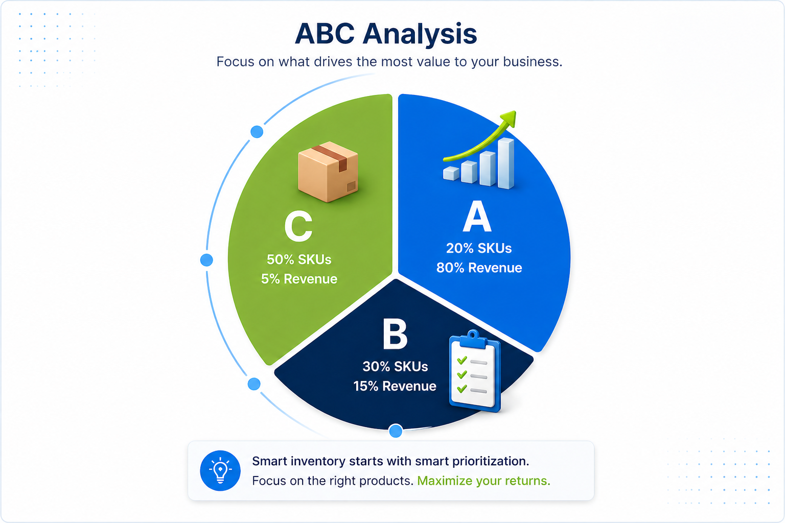 Not every product in your catalog deserves the same attention. Some products drive 80% of your revenue. Others sit in storage for months and drain your working capital. ABC Analysis helps you figure out which is beneficial and manage them accordingly.