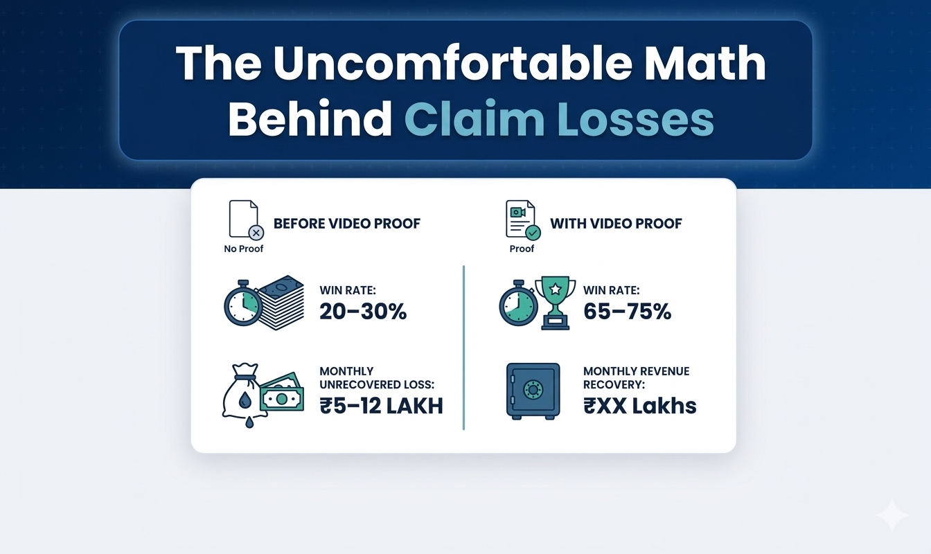 Let’s break it down simply: A mid-size brand shipping 2,000 orders/day can easily see 40–80 disputes daily. With a low claim win rate of 20–30% and an average order value of ₹700–₹1,200, this can lead to about ₹5–12 lakh in monthly losses, just because there’s no proper proof to support claims.